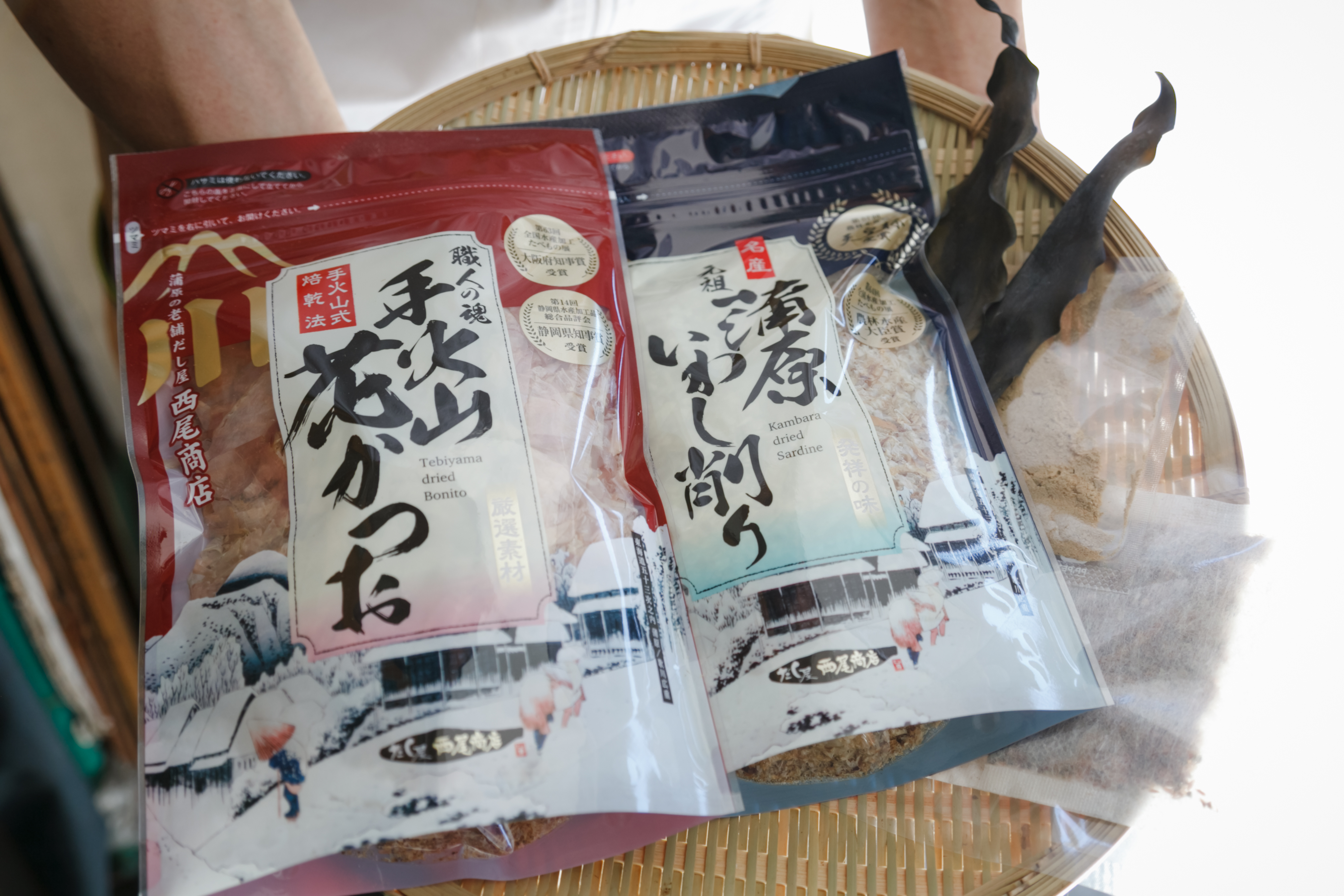 だし屋「西尾商店」さんからは、だしの基本と奥深さを堪能できる特別セットを、キッチハイクのために作っていただきました。第57回農林水産祭の水産部門で最高賞の天皇杯を獲得した「元祖 蒲原いわし削り」と、江戸時代から続く昔ながらの焙乾法で造られた「職人の魂 手火山 花かつお」は、各1袋ずつお届け。イベント内では、花かつおと日高根昆布、西尾さんが試作を重ねてブレンドしたというだしパックをそれぞれ使って、一緒に出汁をとりましょう。粉末の「だしの国 駿河 香りの燻しだし」は、イベント後にカレーの隠し味などに加えてお楽しみください。