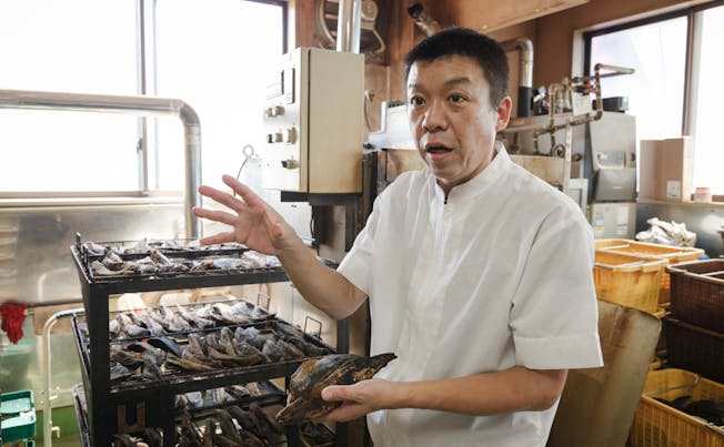 明治時代に広島から静岡・蒲原に1台だけ運ばれたという貴重な削り節製造機を最初に導入した「西尾商店」。4代目にあたる西尾透雄さんは、地元はもちろん、全国各地から良質な素材を仕入れ、旨味と香りを凝縮する遠赤外線焼節製法を使って、最適な温度で管理した削り節を製造しています。