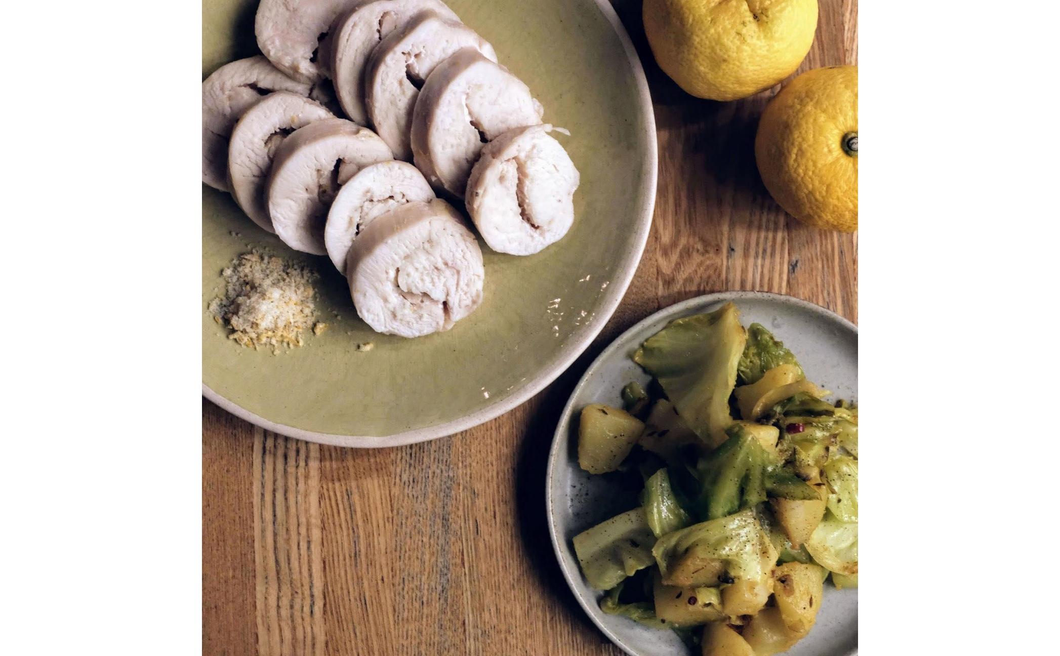 宮崎若鶏の自家製鶏ハム & キャベツとじゃがいものサブジをつくりましょう。