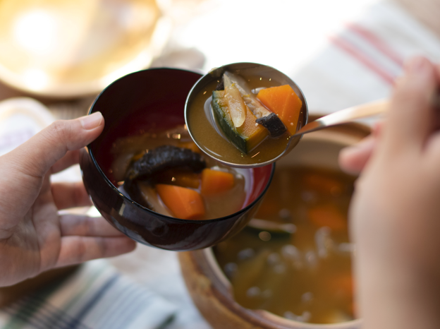 野菜をたっぷり入れた味噌汁に合わせるのは、糀をたっぷり配合し、甘酒も一緒に加えて発酵させた「ふっくら糀」。ふんわりとした甘さをもつこの味噌は、お子さんや女性に人気があり、胃袋を優しく起こしたい朝食にぴったりです。