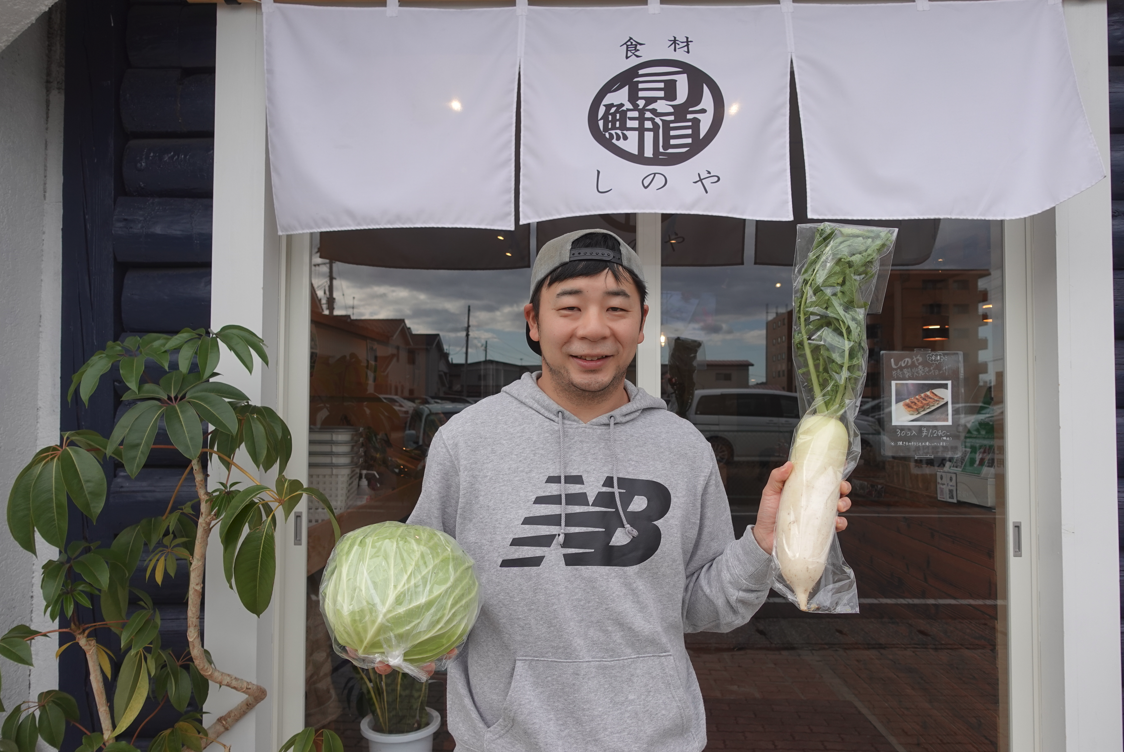 福島県産野菜のセレクト・販売を行う「しのや」の篠原祐太郎です。市内に2店舗ある「居酒屋しのや」を経営しており、「旬鮮直 食材しのや」は2021年の春に実店舗としてオープンしました。郡山市の野菜はもちろん、福島県全域の農家さんの野菜をセレクトして販売しています。