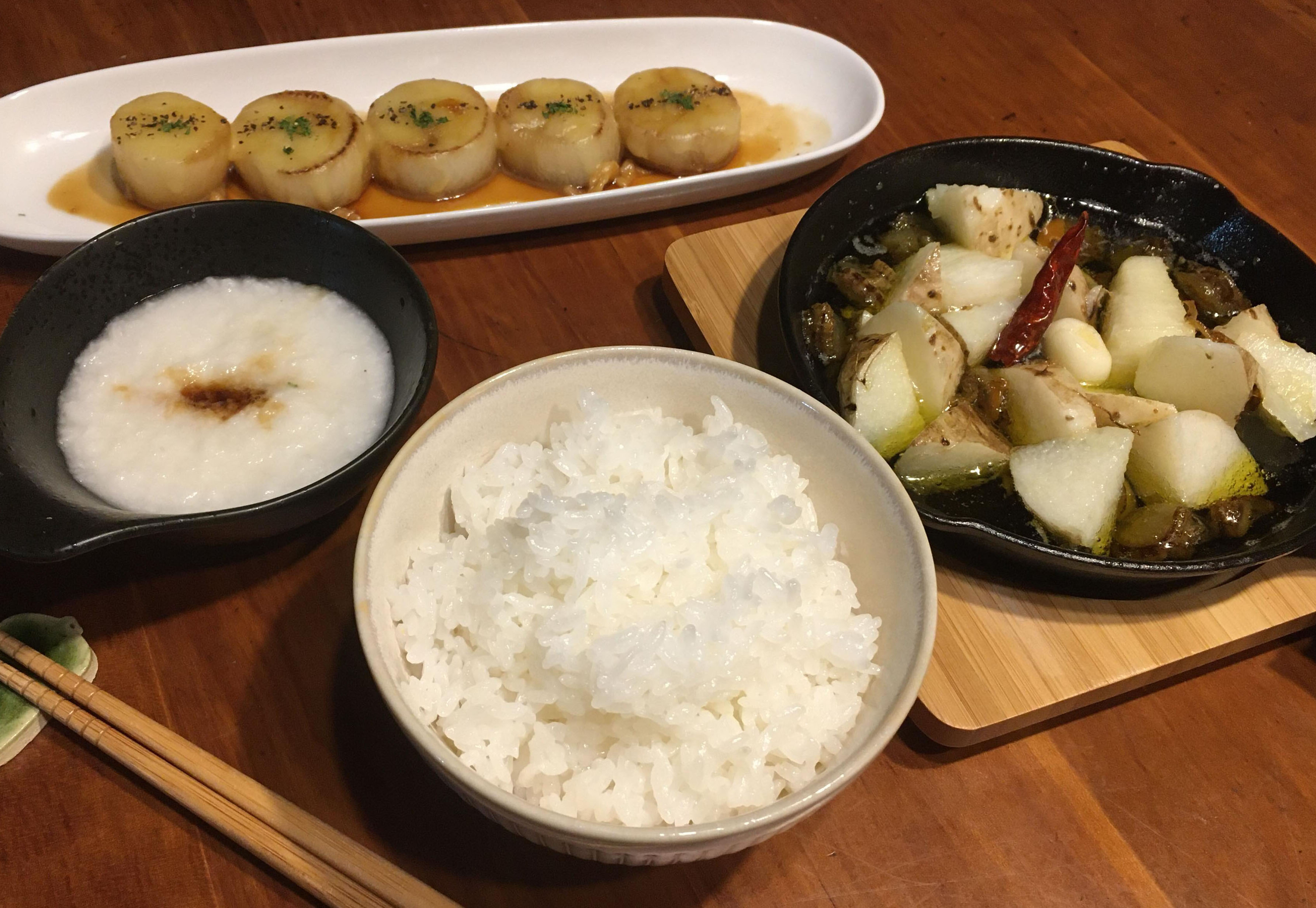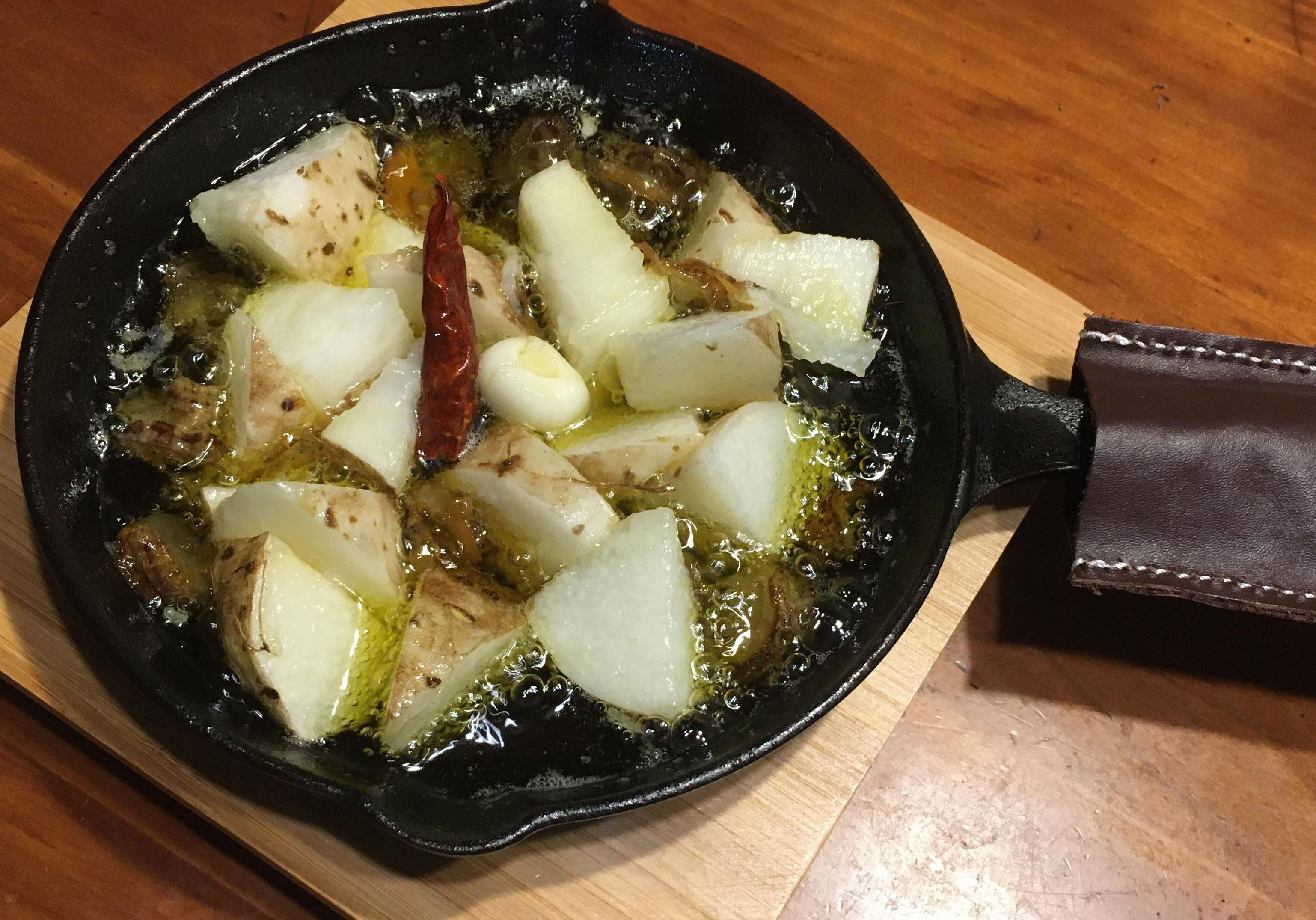 お米を楽しむ定食のおかずには、二瓶さんのお店の人気メニュー「大根のチーズステーキ」と、熱々をいただく「長芋とほたてベビーのアヒージョ」。ほっくり温まる二品を作って、冬の北海道に思いを馳せましょう。