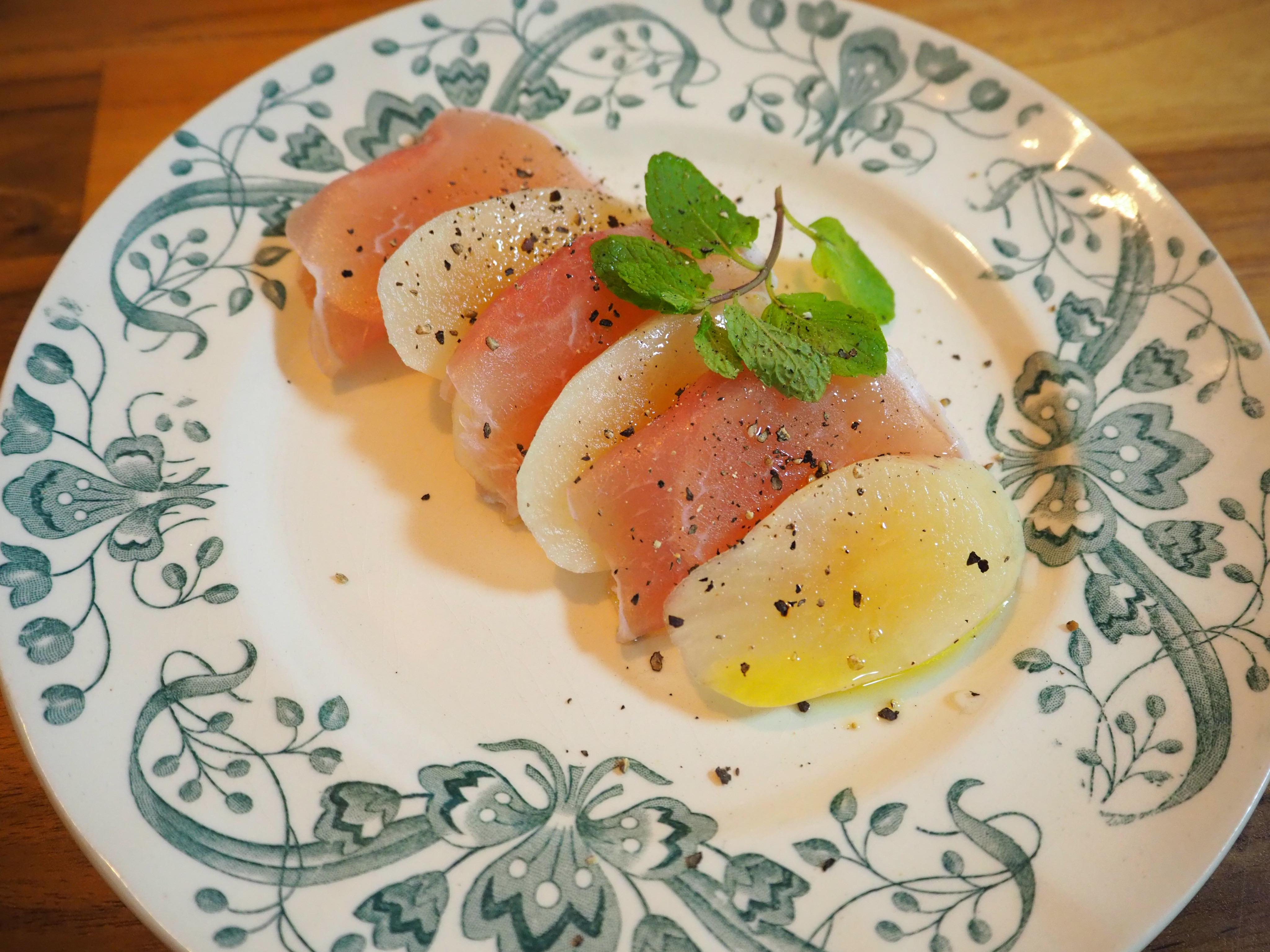 下の写真:レシピをご紹介する「「ヤーコンの生ハム巻き」