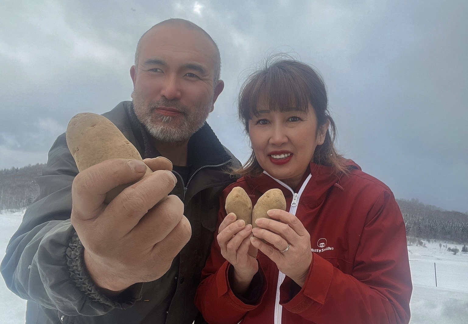 板坂峰行さんは、町内で唯一 ”雪室貯蔵” という工程を、正式に導入するメークイン生産者。そのおいしさを全国に届けたいとの想いから、一手間かけたメークイン生産に踏み切ったのだそうです。傷がつかないように、丁寧にメークインを収穫したあと、その上に土をかぶせて、自然に積もる雪の下で寝かせ、重機で掘り起こすという作業を妻の裕子さんと二人三脚で行っています。また、板坂さんのこだわりは土づくりにも及び、竹炭や魚かすなど自然由来の肥料を選んでいるのだとか。