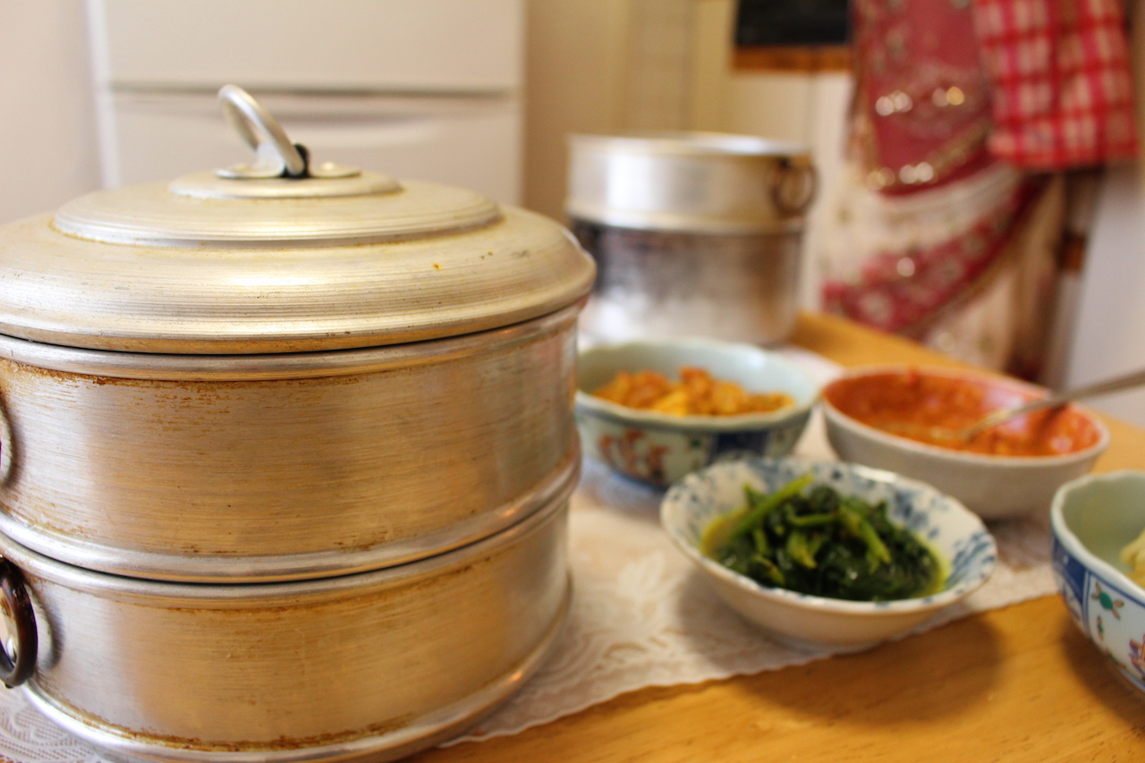 ネパールの餃子、モモを蒸すための調理器具です。金色のものが多いですね
