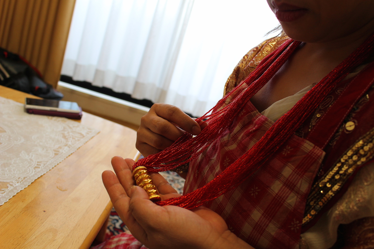 これは赤い糸と金色で作られたアクセサリー。