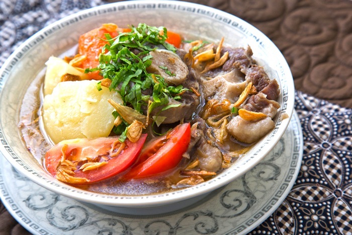メインになるこのスープはオックステールの下ゆでをきちんとするのが大事。だいたい2〜3時間かかるわね。このスープもスタミナ料理として知られているの。インドネシアではジャワ島でよく食べられているわ。