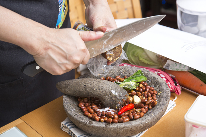 なんと!ソースのためにピーナッツを揚げて、それをチョベックと呼ばれる石の道具でですり潰しちゃいます!!なんとも本格的!!しかもこのソース、一旦作ったら保存も利くので大活躍です。