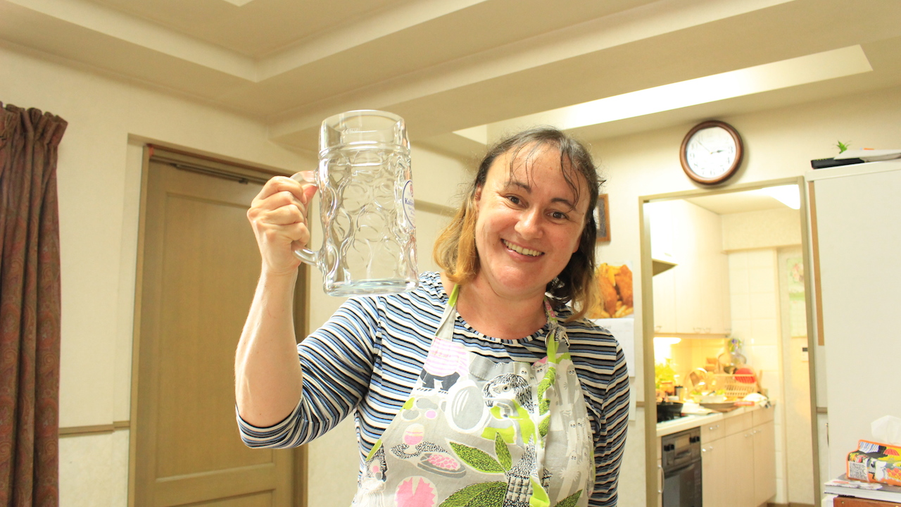 お酒も大好き。ニュージーランドでは、こんな大きいジョッキを使うこともあるのよ。ビールにぴったりね。
