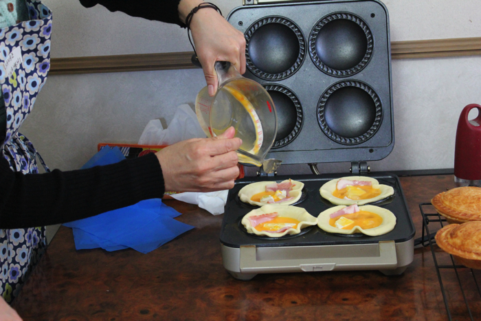ベーコンを敷いて、上から卵液をかけてチーズをトッピング。 これにスライスしたジャガイモを加えてもおいしいの。 具材はなんでもOK! パイメーカーがない場合にオーブンで作るレシピも教えますよ。