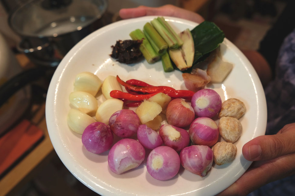 シャロット、ガーリック、唐辛子、レモングラス、キャンドルナッツ、ライムリーフ、ガランガル、タマリンド…インドネシアでは、スパイスをすり鉢に入れて手で細かくしていたから、大変だったわ。でもそれがあってこそ、家庭の味が出来上がるのよ。