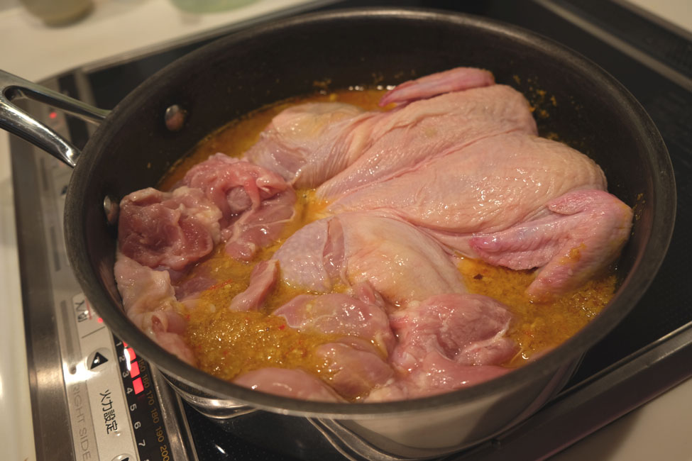 身が柔らかい若鶏を選ぶのがポイント!あらかじめレモンをつけて冷蔵庫で15分程度寝かせておいたものをたっぷりのスパイスで煮込むのよ。