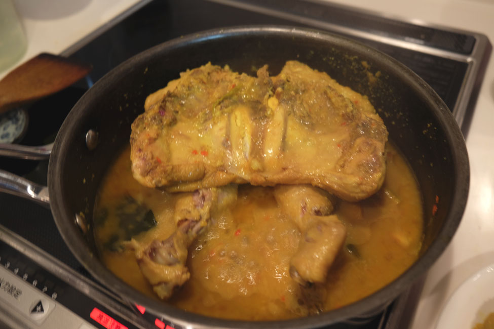 この時点ですでに美味しそうだけれど、このキツネ色になるまでこのチキンをグリルして完成!チキンのエキスとスパイスたっぷりのこのスープは、別でいただきましょう!