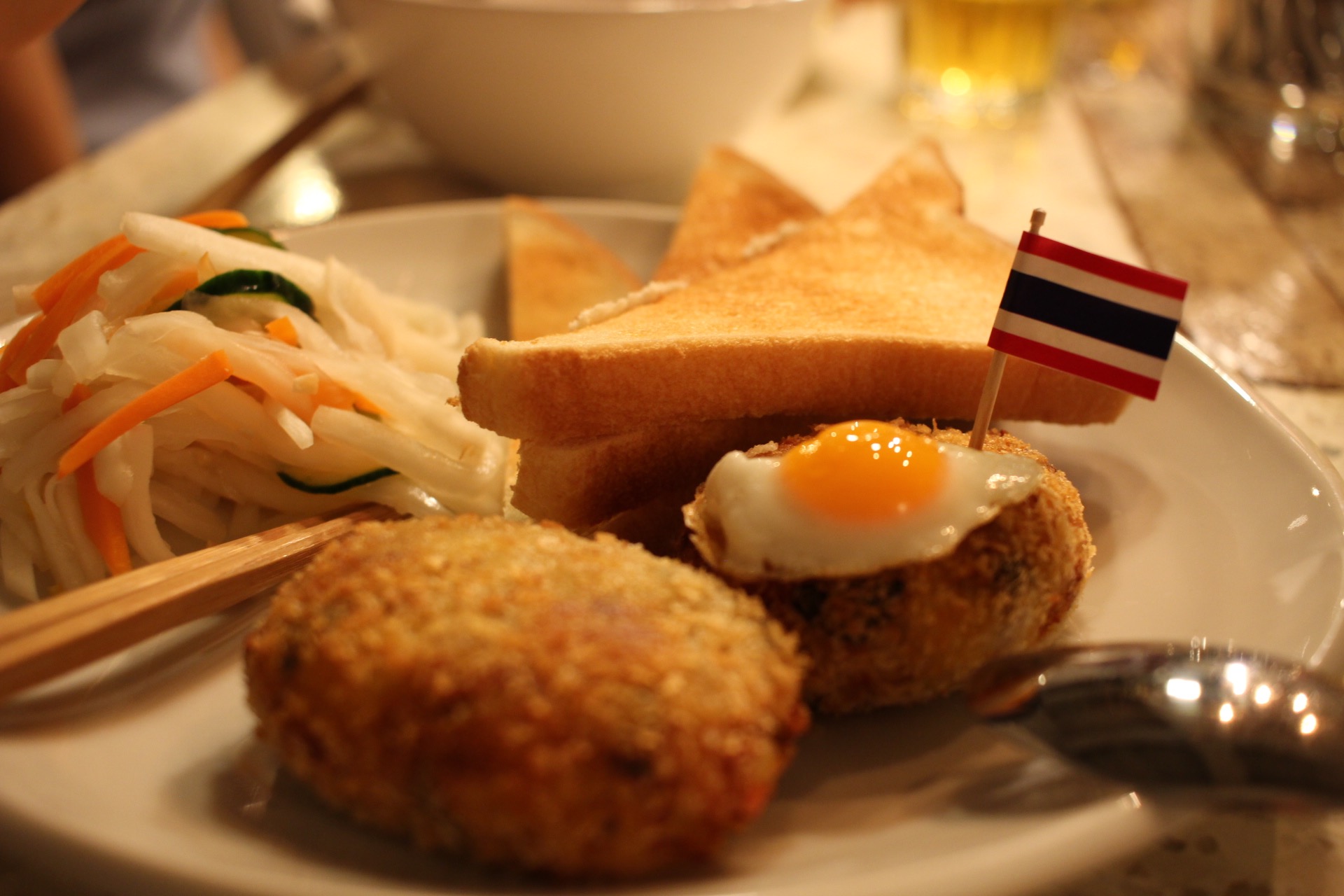 たびころ〜タイ編〜では、ガパオコロッケを。 うずらのたまごの目玉焼きを乗せて、バジルとひき肉がたっぷり入ったミニガパオ風に。