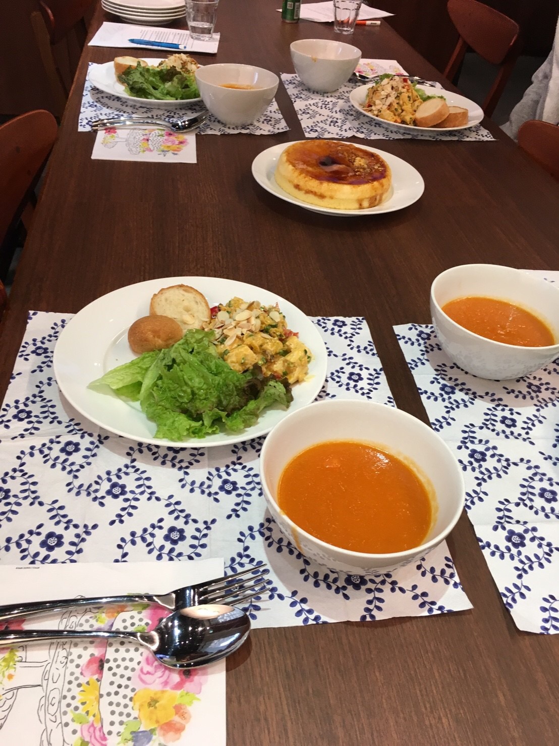 第1回目の英語でCOOKINGのメニューはコロネーションチキン、トマトスープ、カスタードプディングケーキを一つの鍋の三段重ねで調理しました。 一番下でスープ、真ん中で鶏肉を蒸して、更にその上でプリンケーキです。一気に3品できるので、皆さんびっくり(°▽°)でした。