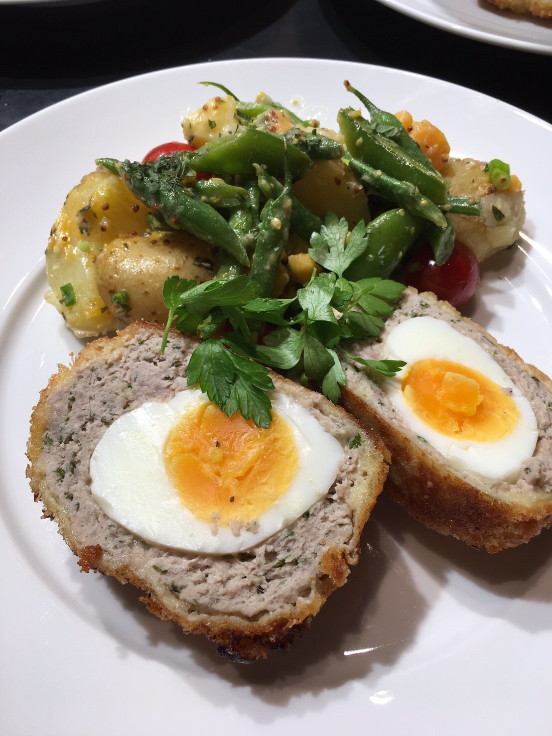 第2回目はスコッチエッグとイングリッシュガーデンサラダ、冷凍ベリーのホットカスタードかけ フライパンに挽肉からフードプロセッサーで作ったお6個の大きなスコッチエッグを入れて蓋をして油で揚げます。 ほんの少しの水で、ゆで卵や野菜、ジャガイモをゆでて、皆さんびっくり(°▽°)してました。水が少ないと食材の栄養や旨味が流れ出ないので、食材の味が凝縮されてとても美味しいですよ。