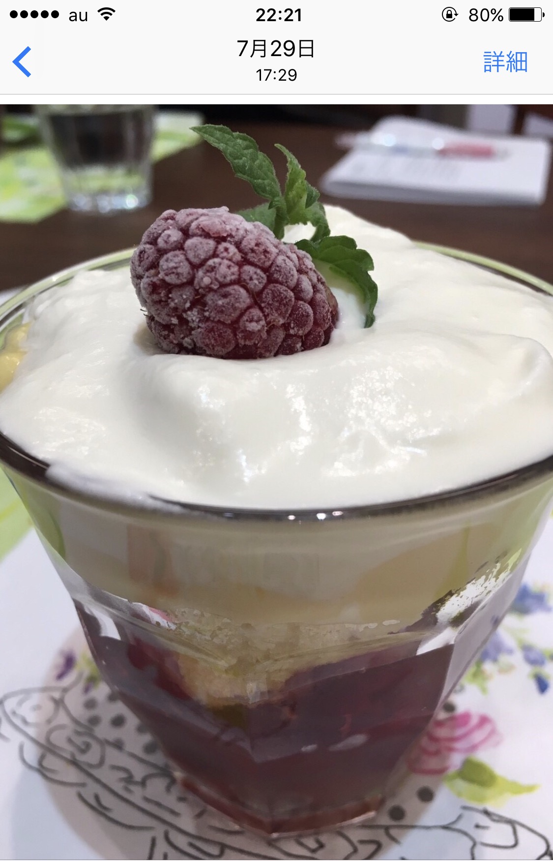 デザートのトライフルです。下からラズベリーのゼリー、スポンジケーキ、カスタードクリーム、生クリームそして仕上げのラズベリーとミントです。 スポンジケーキはフライパンでふっくらと焼きあげました。