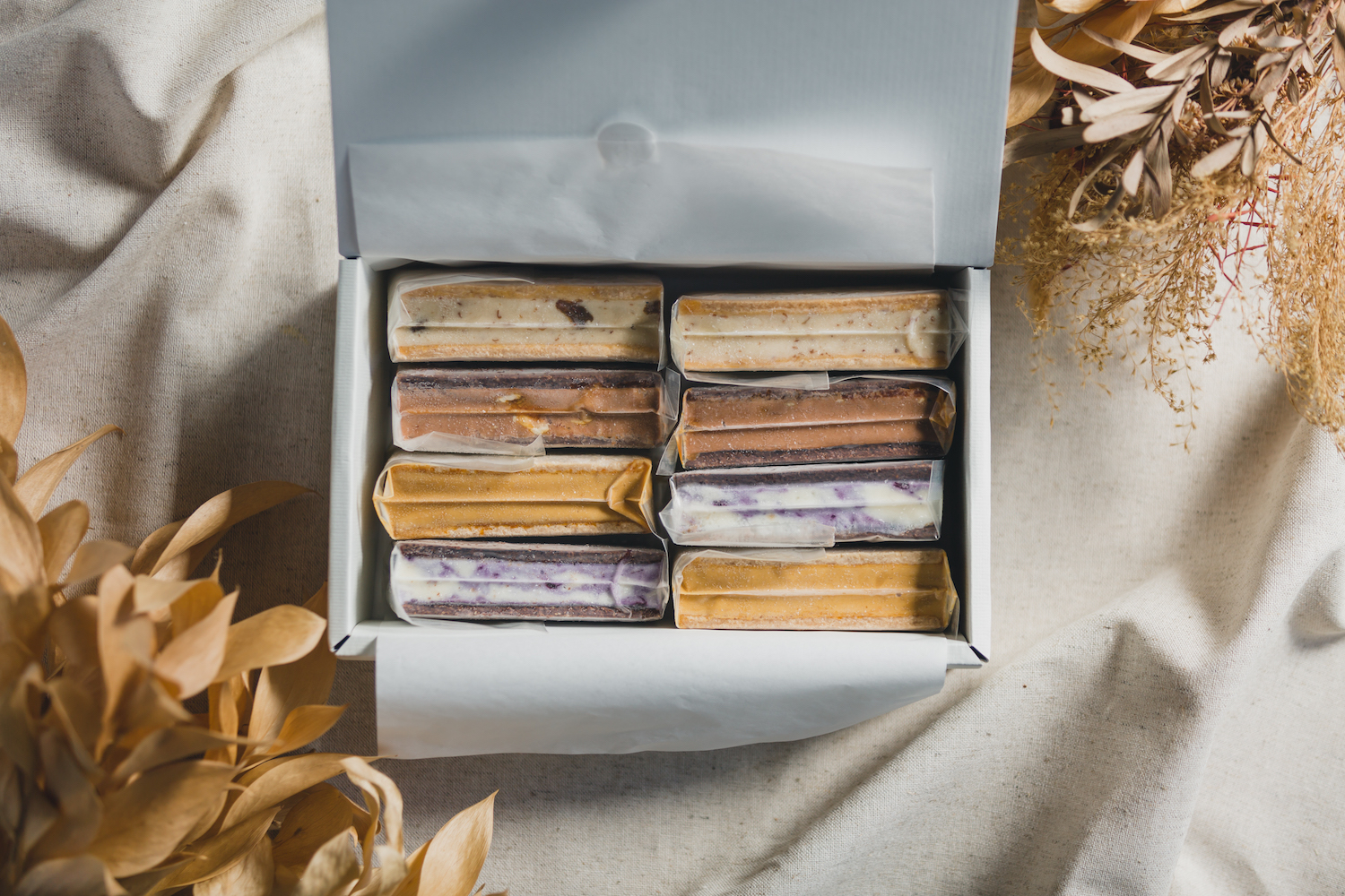 こちらは口溶けの良いアイスを、グルテンフリークッキーで挟んだアイスクリームサンド。フレーバー4種×が2個ずつ入った8個入りセットです。(季節によりフレーバーが変わります)