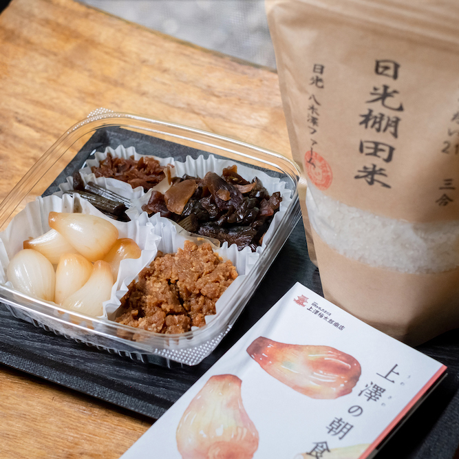 4種類のたまり漬(らっきょう、ふき、しょうが、七種刻み合わせ)と、通常商品には入っていない日光味噌を特別に詰めた、キッチハイクだけの『日光味噌入り 限定おうちたまてばこ』をご用意しました。たまり漬と相性がよい八木澤ファームの棚田米 (3合) も一緒にお届けします。