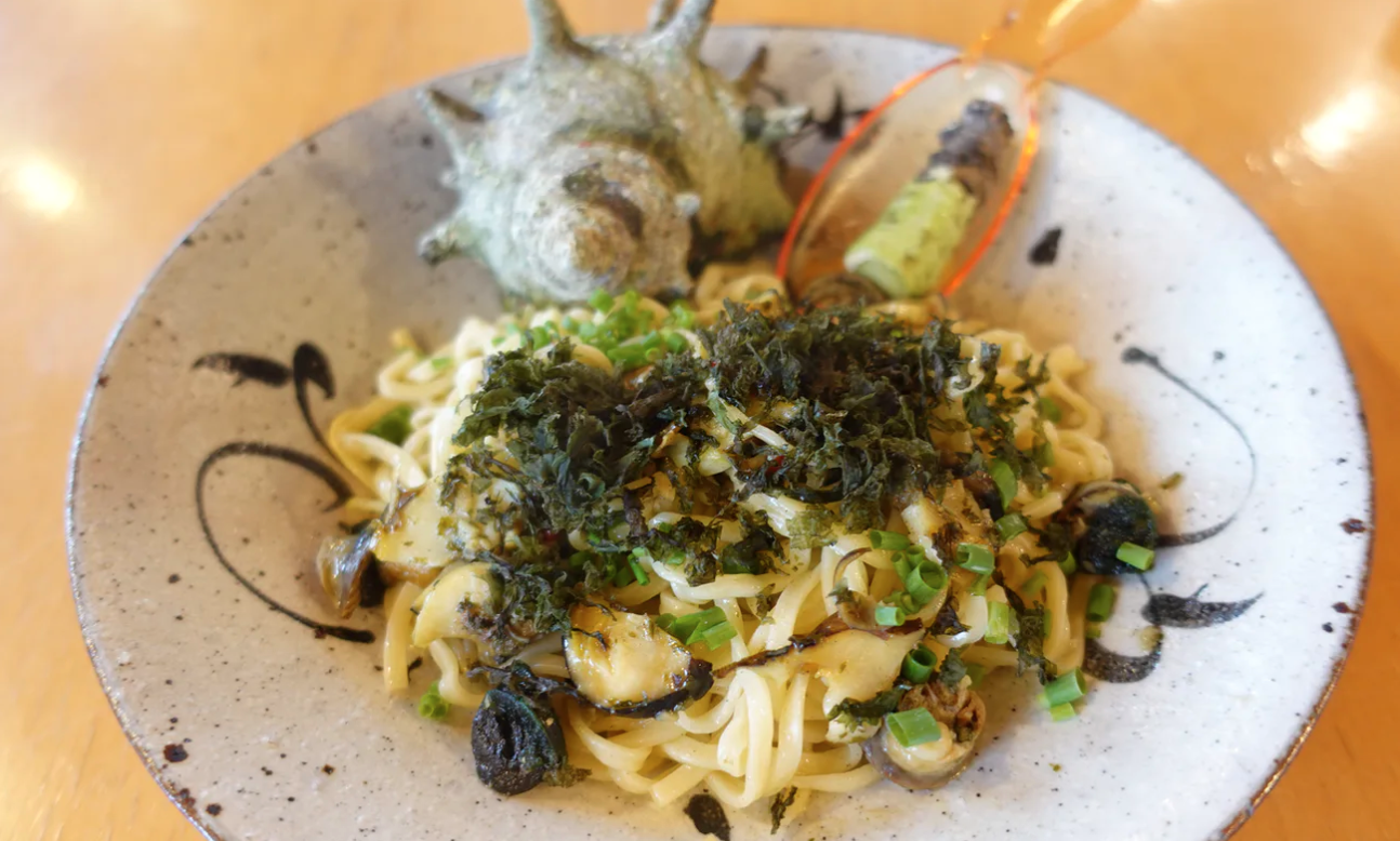 コリコリ食感がたまらない、活サザエをつかった「しいの木やま」さんの看板メニューをアレンジした「南伊豆産 活サザエと海苔のパスタ」を一緒に作れる動画など、人や食材の魅力に出会う体験セットをお届けします。