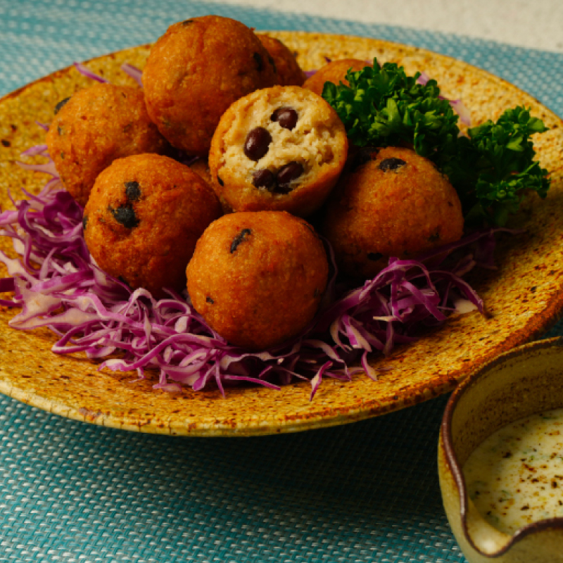 • 少しエスニックなおかずを試したい時にぴったりな、お肉不使用のファラフェル風コロッケ。黒千石大豆のほくほく食感とほのかな甘みを味わえます。ヨーグルトソースの爽やかな酸味が、スパイスを引き立て、ついつい箸が止まらなくなる一品。ピタパンに挟んでサンドにするのもおすすめです。