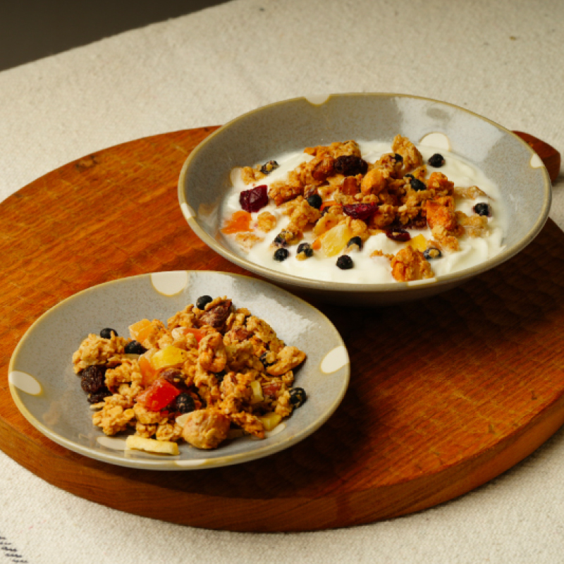 ③クッキングシートをしいた天板にスイーツタイプ、おつまみタイプそれぞれを薄く延ばすように広げてのせる。170℃のオーブンでまず15分焼き、一度取り出して手でざっくりと砕き、再度15分焼く。焼き終わったら、スイーツタイプにドライフルーツを混ぜて完成。