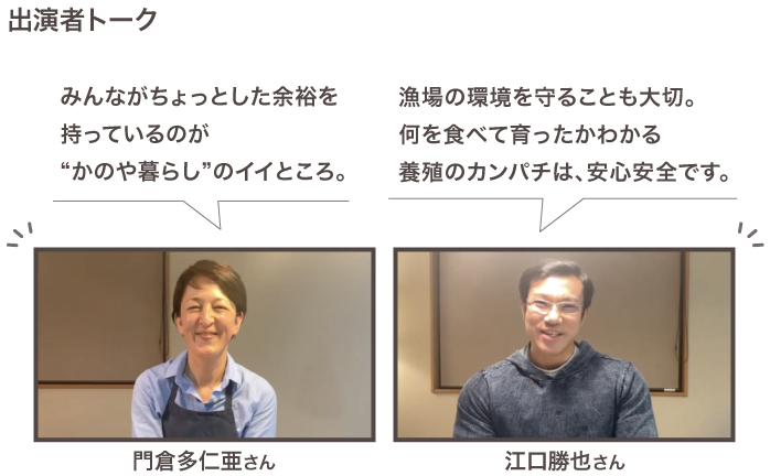 生産者代表として登場いただくのは、鹿屋市漁協の江口勝也(えぐち・かつや)さん。養殖現場の臨場感が伝わる動画を見ながら、新鮮なカンパチを届けるための生産者の努力とチームワークについてお伺いします。聞くところによると、なんと「かのやカンパチ」は、バラの花が配合された餌を食べて育つのだとか!半世紀にわたり養殖技術を磨いてきた鹿屋市漁協の挑戦を通して、「かのやカンパチ」のおいしさの秘密をひも解きます。